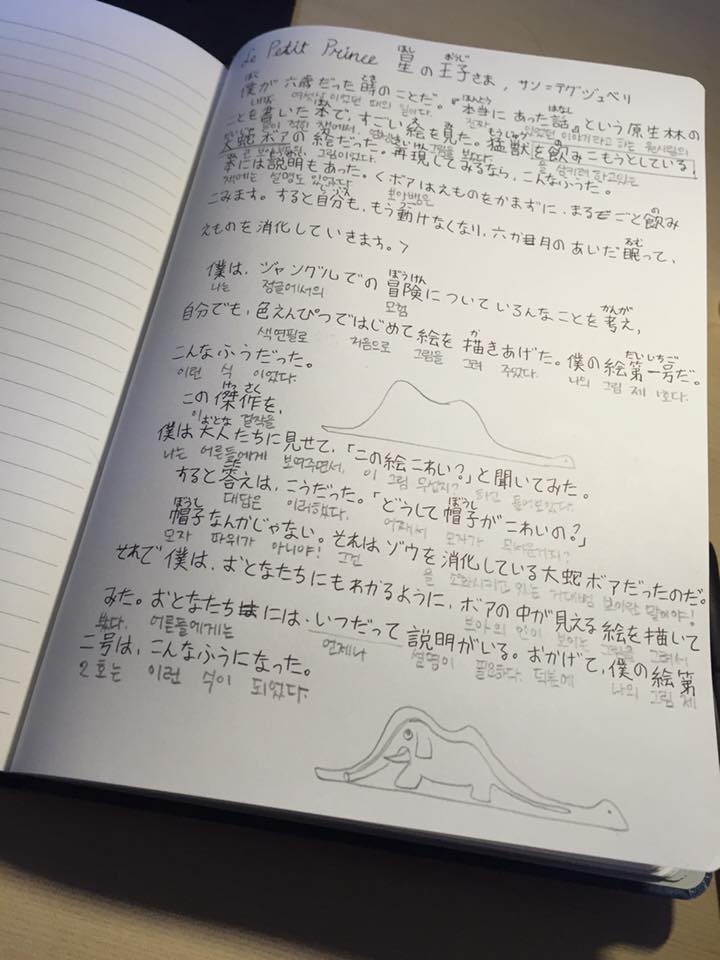 사실 기본적인 어휘와 문법이 되어 있으니 N4, N3 정도의 독해까지는 그냥 무난해졌다. 그러다보니 JLPT 독해가 재미가 없어져서, 필사를 한 권 시작했는데 그게 유명한 생텍쥐베리의 어린왕자였다. 개인적으로 나는 글씨쓰는 것도 좋아하고, 내 글씨도 좋아하는 지라 취미생활이자 독해 공부로 매우 요긴했다.
